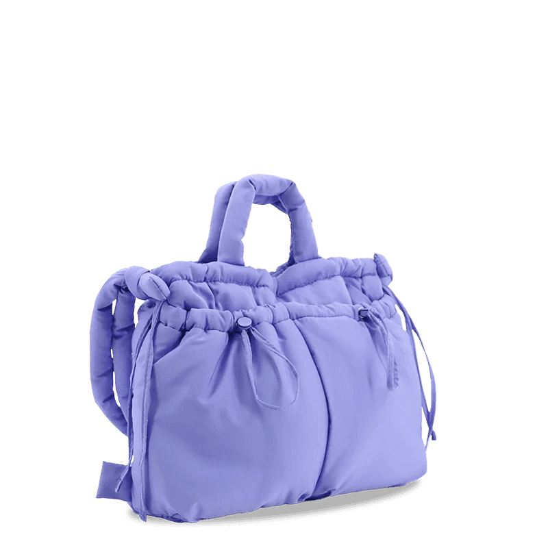 The Puffy Tote is a versatile, stylish bag with adjustable handles for comfort and two front pockets for easy access to essentials. It transforms into a backpack for hands-free use. With a spacious compartment and inner pocket, it fits everything from books to gym gear.