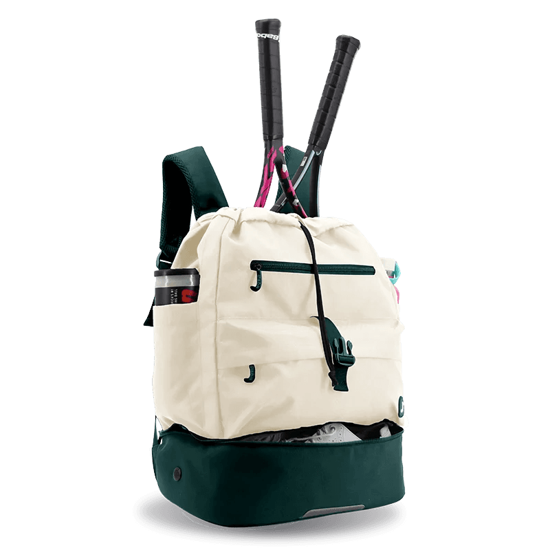 The ACE Backpack is perfect for racket sports like Tennis, Pickleball, and Badminton. It fits two rackets, with space for shoes, clothes, and gear. Features include a padded divider, separate shoe compartment, water bottle pockets, utility pocket, fence hook, and reflective tape for added visibility and safety.